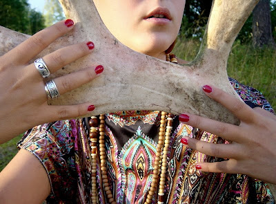 Tunika on Stradivariuksesta, samoin se isompi helmikoru. Korvikset on ostettu joskus muinoin Seppälästä. Sarvesta ei ole tarkempaa tietoa, kuin että se lojui meidän takapihalla.